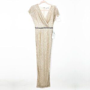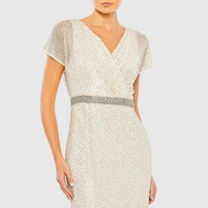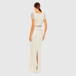 NWT Mac Duggal Beaded Short Sleeve Column Gown Nude Silver 2 #A0177