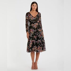 NWT Mac Duggal Black Floral Embroidered Tea Length Dress