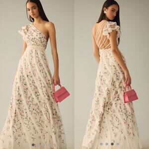 NWT Mac Duggal Cream Floral Embroidered One Shoulder Maxi Dress Sz 8