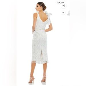 This dress by Mac Duggal 79337 is an attractive choice for your next party. Featuring a sleeveless design with a rosette at one side, the dress has a V-neck and back. It has an embellished waistband and sheath silhouette embellished with beads and sequins. The dress ends at the tea length and has a slit-cut at the center-back.