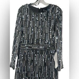 NWT Mac Duggal Embellished High Neck Long Sleeve Fitted Midi Charcoal Dress 8