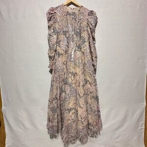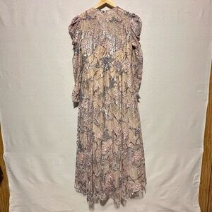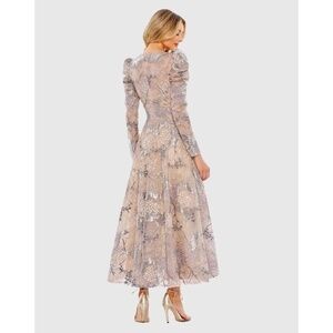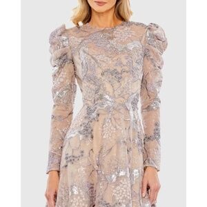 NWT Mac Duggal Embellished High Neck Puff Sleeve A-Line Dress in taupe (I would say various shades of purple-ish pink). Fully lined gown with soft internal structure and lightly padded shoulders for support. Long sleeves and fitted waist offer tailored shape. Metallic floral embroidery on tulle adds texture, while hidden back zipper ensures a smooth finish. On top of the liner is a layer of tulle in the skirt, followed by lace with clear sequins throughout for shimmer, then the layer of embroidered mesh. Size 12.