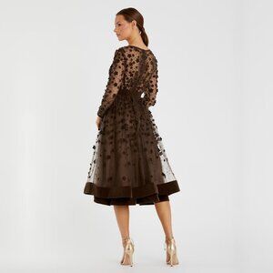 Elegant tea-length cocktail dress with a semi-sheer illusion yoke and sleeves, tulle overlay skirt, and intricate velvet floral accents and beading throughout. A tonal velvet band accents the natural waist, and the skirt is finished with a velvet-trimmed bottom hem.