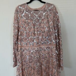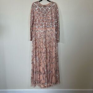 NWT Mac Duggal Embellished Illusion High Neck Long Sleeve A Line Blush Gown 16