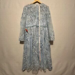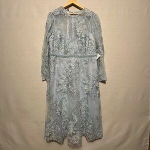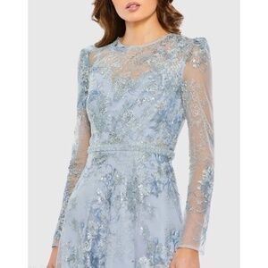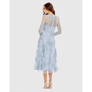 NWT Mac Duggal Embellished Illusion Long Sleeve Midi Dress in powder blue. Our Embellished Illusion Long Sleeve Midi Dress—a mesmerizing choice for your next event. This dress boasts intricate embellishments that add a touch of glamour to its timeless design. The midi length ensures a classic silhouette that's perfect for various occasions. Size 18.