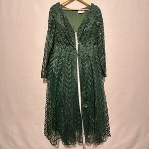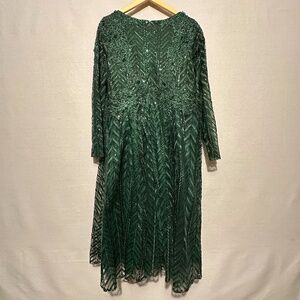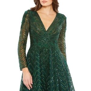 NWT Mac Duggal Embellished Long Sleeve Wrap Over Dress in emerald green. This long sleeve dress showcases stunning sequin-embroidered fabric, adding elegance to any occasion. The sheer, unlined sleeves create a hint of allure, while the flattering V-neckline and embellished waist with heat-set jewel-encrusted details make this dress a true statement piece. Size 14.