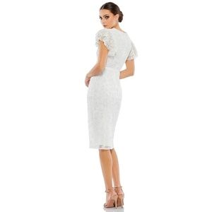 NWT Mac Duggal Flounce Sleeve Midi Dress in white. Chic beaded sheath dress with a high round beck, feminine flutter short sleeves, and allover bead-and-sequin floral embellishment. Waist is accented by a dainty hand-beaded belt. Midi-length skirt features a back vent slit. This dress is HEAVY - easily 5 lbs. Size 24.