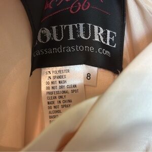 This breathtaking gown by Mac Duggal is a masterpiece of elegance, featuring a strapless neckline and intricate gold embellishments that shimmer against a luxurious tan fabric. Perfect for a bride or wedding guest, the gown's fitted bodice gracefully transitions into a flowing silhouette, exuding sophistication and charm.