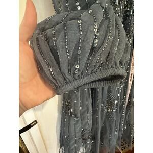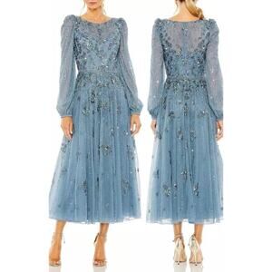Be the belle of the ball in this stunning Mac Duggal floral embellished midi dress. The high neck and puff sleeves add a touch of glamour, while the A-line silhouette and slate blue color make it perfect for any season. The dress features a zip closure and is perfect for formal occasions or a night out on the town. The princess theme adds a fairytale element to the dress, making you feel like royalty. Available in size 6, this dress is sure to turn heads.