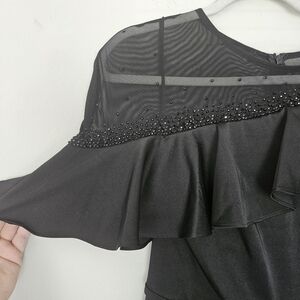 Long slit /faux wrap skirt. Illusion one shoulder with a ruffle. Double chest fabric with padded cups.