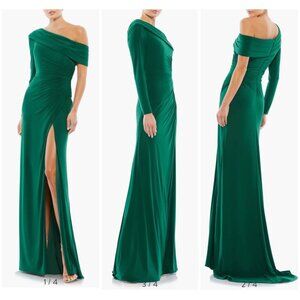 NWT Mac Duggal Ieena RUCHED JERSEY DROP One SHOULDER FOLDOVER Long Fitted Gown Emerald Green Womens 4 MSRP $358