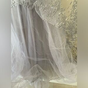 This dreamy gown is made with clusters and dashes of sequins for an ombré-like effect. Cut in a graceful, A-line shape, the dress is styled with an illusion round neck, bishop sleeves and a sparkling skirt with a sweep train finish.