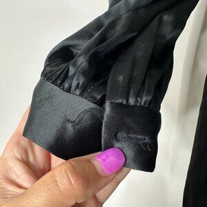Chic long-sleeved jumpsuit in silky satin charmeuse completed with a plunging neckline, puffed sleeves, and ruching at the waist.