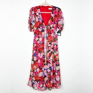 NWT Mac Duggal Multicolor Floral Front Tie Puff Sleeve Flowy Dress 8 #A0541