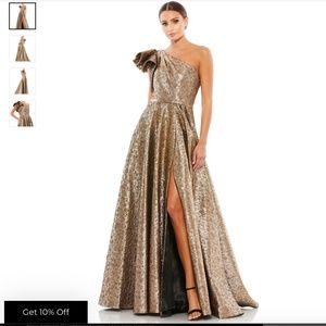 NWT: Mac Duggal ONE-SHOULDER METALLIC BALLGOWN