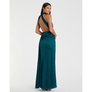 Experience sophistication in this stunning Open Back High Neck Side Ruched Gown. Crafted from luxurious satin fabric, it features a halter neckline, ruched waist detailing, and a thigh-high slit, making it the perfect gown for any special occasion.