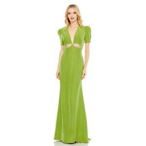 NWT Mac Duggal Plunge Neck Puff Sleeve Cut Out Gown Apple Green 12