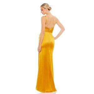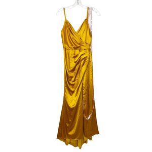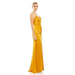 NWT Mac Duggal Satin Sleeveless Faux Wrap Ruched Gown Marigold 2 #9519