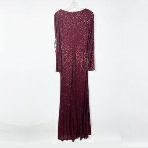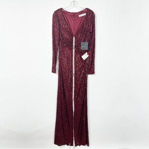 NWT Mac Duggal Sequined Faux Wrap Long Sleeve Column Gown Wine 4