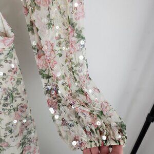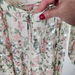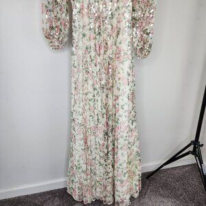 Color: Brand color: White Multi - this dress looks like an off white not a true white and has pink and green floral print with hand stitched sequins allover