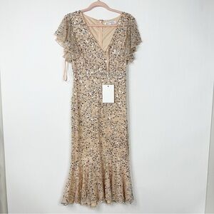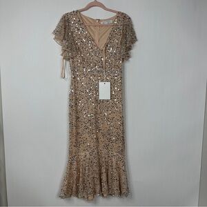 NWT Mac Duggal Sequined V Neck Flutter Cap Sleeve Trumpet Dress in Nude Silver