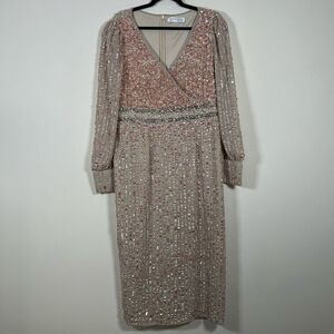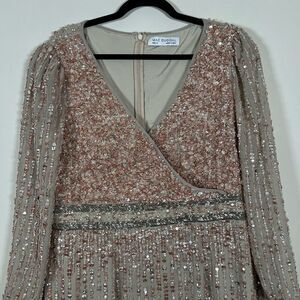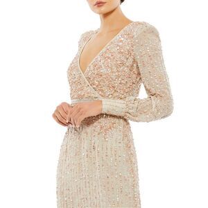 NWT Mac Duggal Sequined V Neck Bishop Nude Sleeve Dress 14