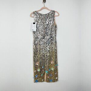 This chic, fully sequined midi dress has a metallic silver bodice that gradually transitions to a metallic gold mid-thigh. The straight, midi-length skirt is embellished with stunning hand-beading and 3D floral accents.