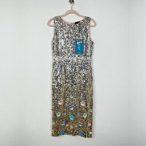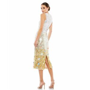 NWT Mac Duggal Silver High Neck Midi Sequin Dress 3D Flower Silver Multi 8 #8322