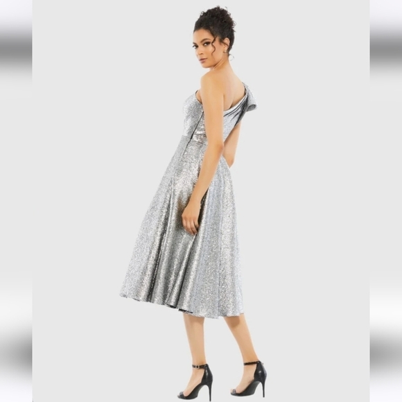 NWT Mac Duggal Silver Metallic Ruffled One Shoulder Fit & Flare Dress Size 2