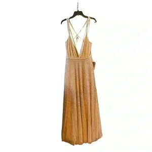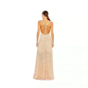 NWT Mac Duggal Embellished Criss Cross Strap Evening Gown in Nude Silver Size 10.