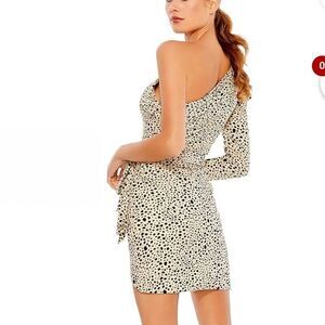 $298 IEENA FOR MAC DUGGAL Animal Print One Shoulder Draped Mini Dress Dalmation
