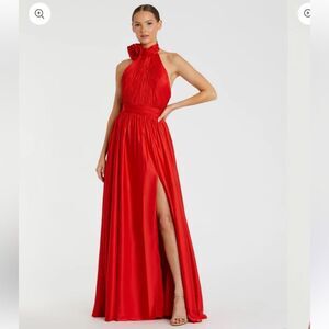 NWT Mac Duggal Red Soft Tie Halter Neck High Slit Gown dress rosette chiffon