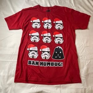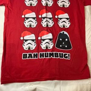NWT Mad Magazine Red Star Wars Short Sleeve T-Shirt. New with tag, never worn. Graphic t-shirt featuring 8 storm troopers with Santa hats on and 1 Darth Vadar with Bah Humbug written under the pics. Has short sleeves and a crew neck.