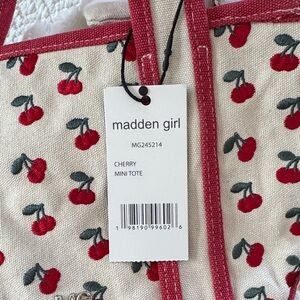 Charming tote by Madden Girl with cherry design. Features red and cream colors. Includes playful keychain accessories.