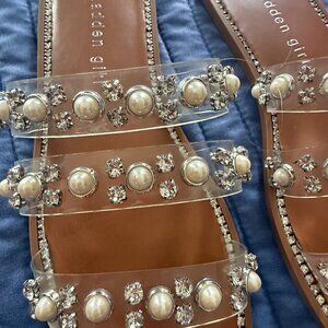 -Super cute clear sandals with rhinestones and faux pearls on the straps