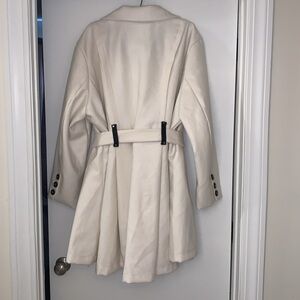 Short trench coat. Large buttons. Belt tie. White. Lined. Winter jacket.