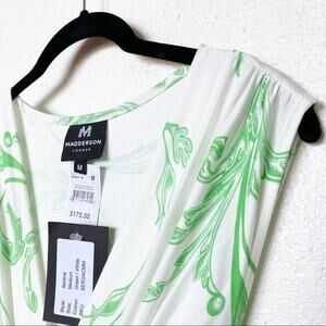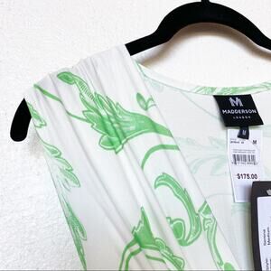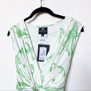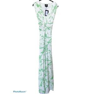 Gorgeous maxi length white and green dress from Madderson London. Serena style. White base with with green pattern. Knotted detail on the front gathers to accentuate your bump! Perfect for a shower or any other event! Sleeveless, v-neck, tie back.