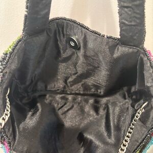 This vibrant tote bag features a stunning array of beaded fringe in multiple colors, perfect for adding a pop of color to any outfit. The black base provides a sleek contrast, making it a versatile accessory for any occasion.