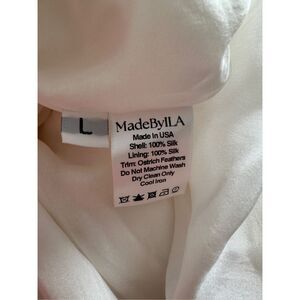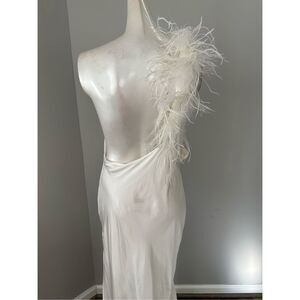 NWT MadeByIla One Shoulder Ostrich Feather Trim Open Back Silk Emma Gown White Large $1200