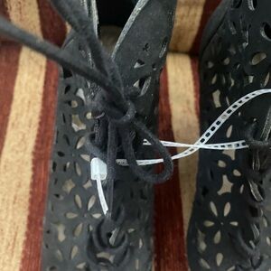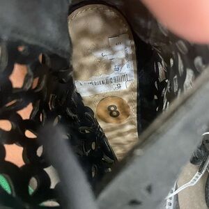 NWT Madeline Stuart black heel with flower design. Zipper in back size 8. Please note the last picture, as it shows some material separation. Approximate measurement of heel is 4