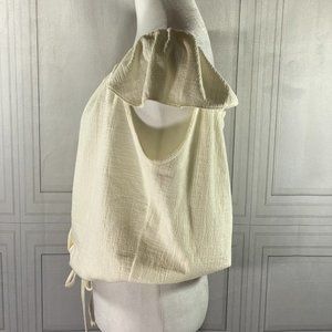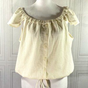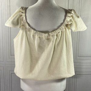 Elastic off the shoulder neckline with flutter sleeves. The drawstring hem is great for length adjustment, can wear at cropped or normal waist length.