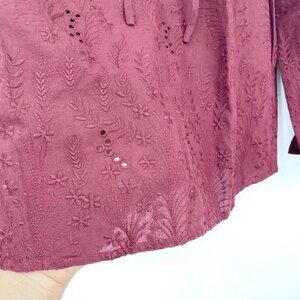 Make the case for winter-appropriate eyelet in this popover top with allover floral embroidery and feminine ruffles at the neck and wrists. Leave the ties undone for an effortless look that defies seasons.