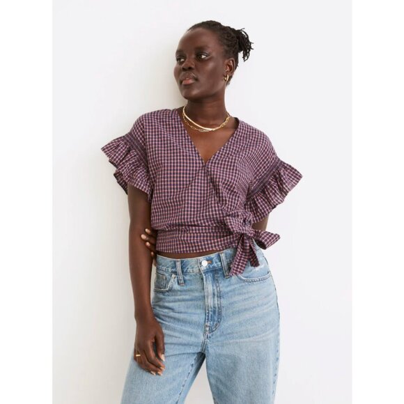 This Madewell flutter-sleeve wrap top blends preppy charm with an easy, feminine silhouette. The blue-and-red plaid pattern brings a classic warm-weather feel, while the side-tie wrap design allows for adjustable shaping and a flattering fit. Lightweight cotton makes it breathable and ideal for spring and summer styling—perfect with denim, shorts, or skirts.