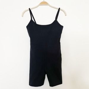 - The fit: like a combo of a cami and our gold-standard knit biker shorts, this one-piece unitard has a built-in shelf bra