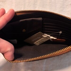 streamlined leather pouch is fitted out with card slots and a snap-close compartment. Throw it inside your tote or carry it as a clutch—it's that versatile. Embossed leather. Zip closure. Interior pockets. 6"H x 9"W. NWT and perfect condition!