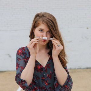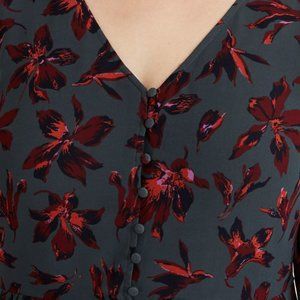 Your new party dress = this pretty mini with romantic details like a floral print, tiny covered buttons, and flowing ruffled sleeves.