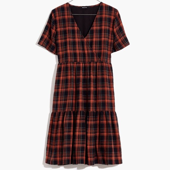 NWT Madewell Plaid Faux-Wrap Short-Sleeve Tiered Mini Dress, Sz XXS