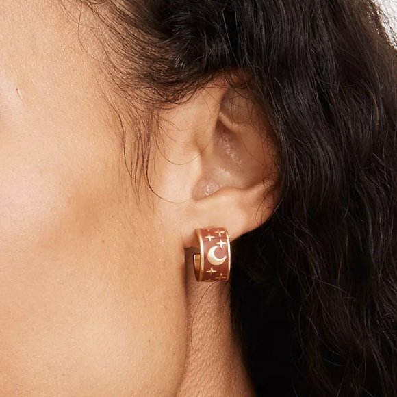Add some subtle color to your piercing story with these mini enamel hoop earrings with star and moon design.