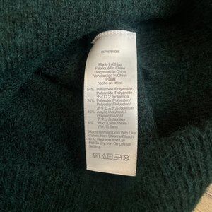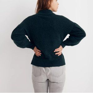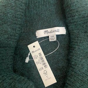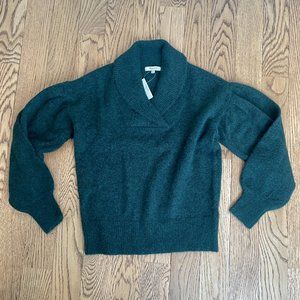 New with tags (NWT). Madewell Vinson Shawl-Collar Sweater. Color is "heather bottle" - a deep forest green. Size is Extra Extra Small (XXS). This cozy pullover sweater has a cross-over shawl collar with V-neck, pleated balloon sleeves, relaxed fit, and wool blend for warmth (Polyamide/polyester/acrylic/wool). MRSP $110.