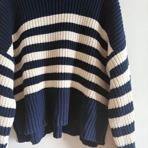 Madewell striped sweater, ribbed turtleneck, indigo stripe knit, women’s large sweater, coastal chic knitwear, French girl style, quiet luxury basics
